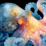 Abyssal Gold – Octopus Luminescence Print glows with hypnotic beauty and rich oceanic hues. Golden filigree patterns trace each tentacle in a dance ...[+]