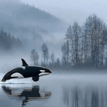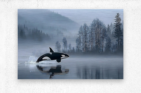 Whispers of the Sea – Orca in the Mist Print captures a rare, poetic moment of marine majesty — an orca breaking through still waters under a veil...[+]