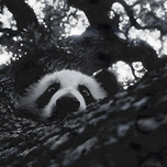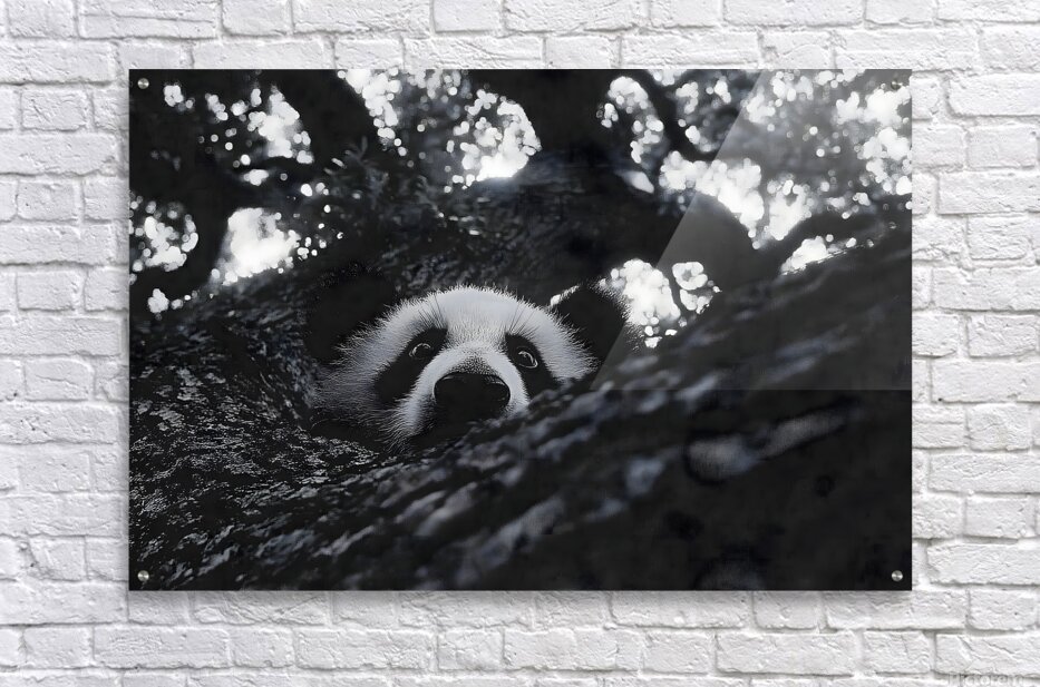Peek-A-Boo – Panda Portrait Print captures the playful innocence of a panda peering curiously from its hiding spot in a forest tree. This black-and-...[+]