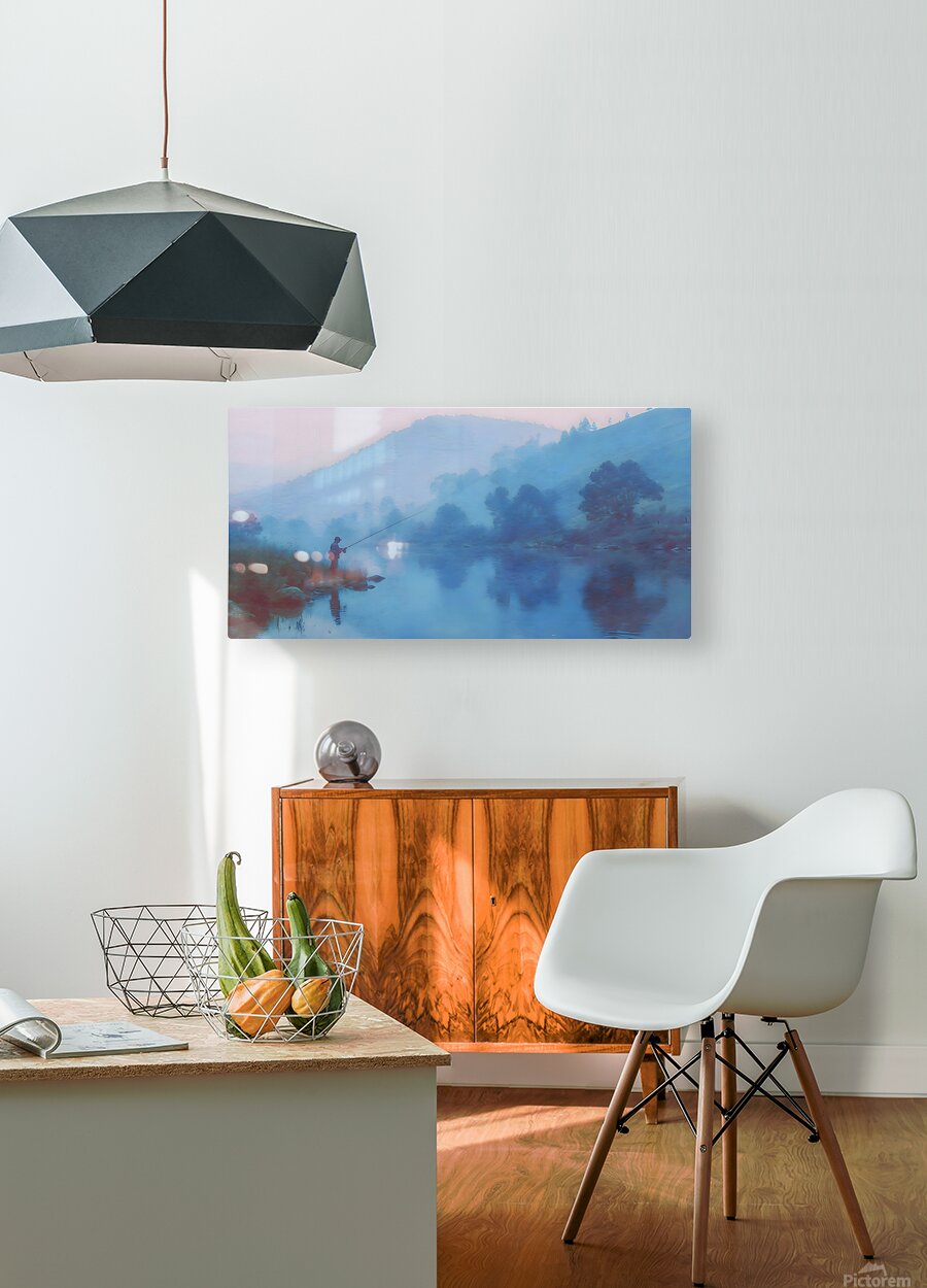 Morning Stillness – Misty Lake Fishing Print freezes that impossible quiet just before the first cast. A lone angler stands on a point while the lake mirrors fog, trees, and sky so perfectly the horizon nearly disappears. Soft blues and violets blur into one another, turning the entire scene into a calm, meditative wash of color. This is for people who wake up earlier on fishing days than they ever do for work—a visual deep breath on the wall. This artwork is available as a giclée canvas print, premium acrylic print, smooth white metal or brushed aluminum piece, and high-definition sublimatable metal panel that holds subtle gradients and soft mist beautifully. You can also choose a peel-and-stick mural to turn an entire wall into a lakefront, framed editions for ready-to-hang serenity, fine art paper prints for a gentle, matte look, warm wood prints, multi-panel configurations for wider spaces, or puzzle prints for those who want to slowly assemble the quiet. Curated by Savage Art Prints.