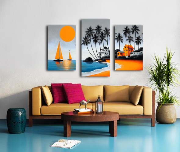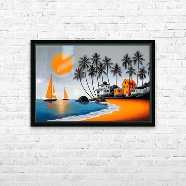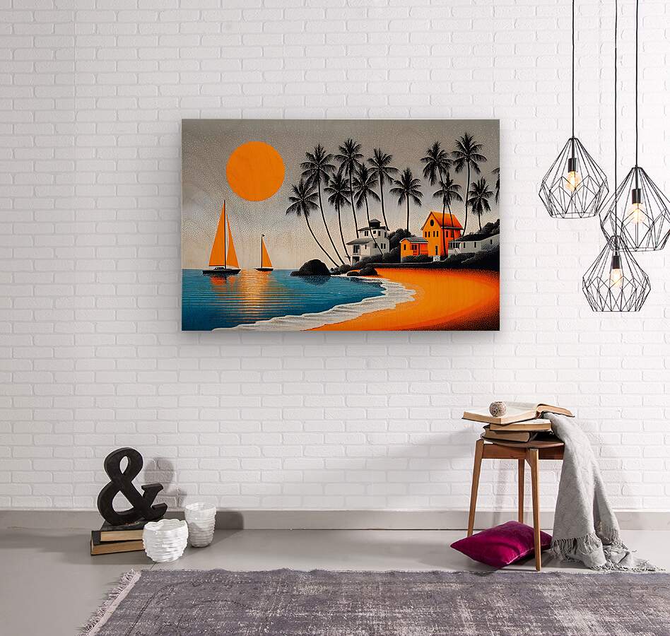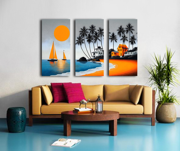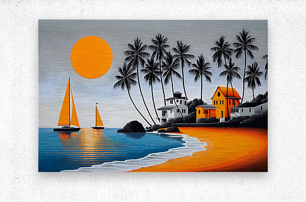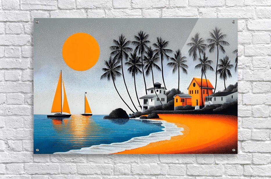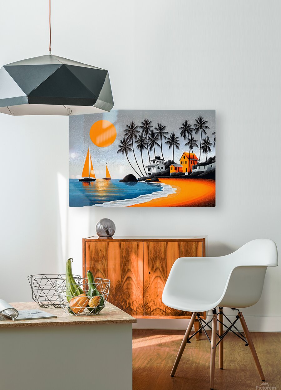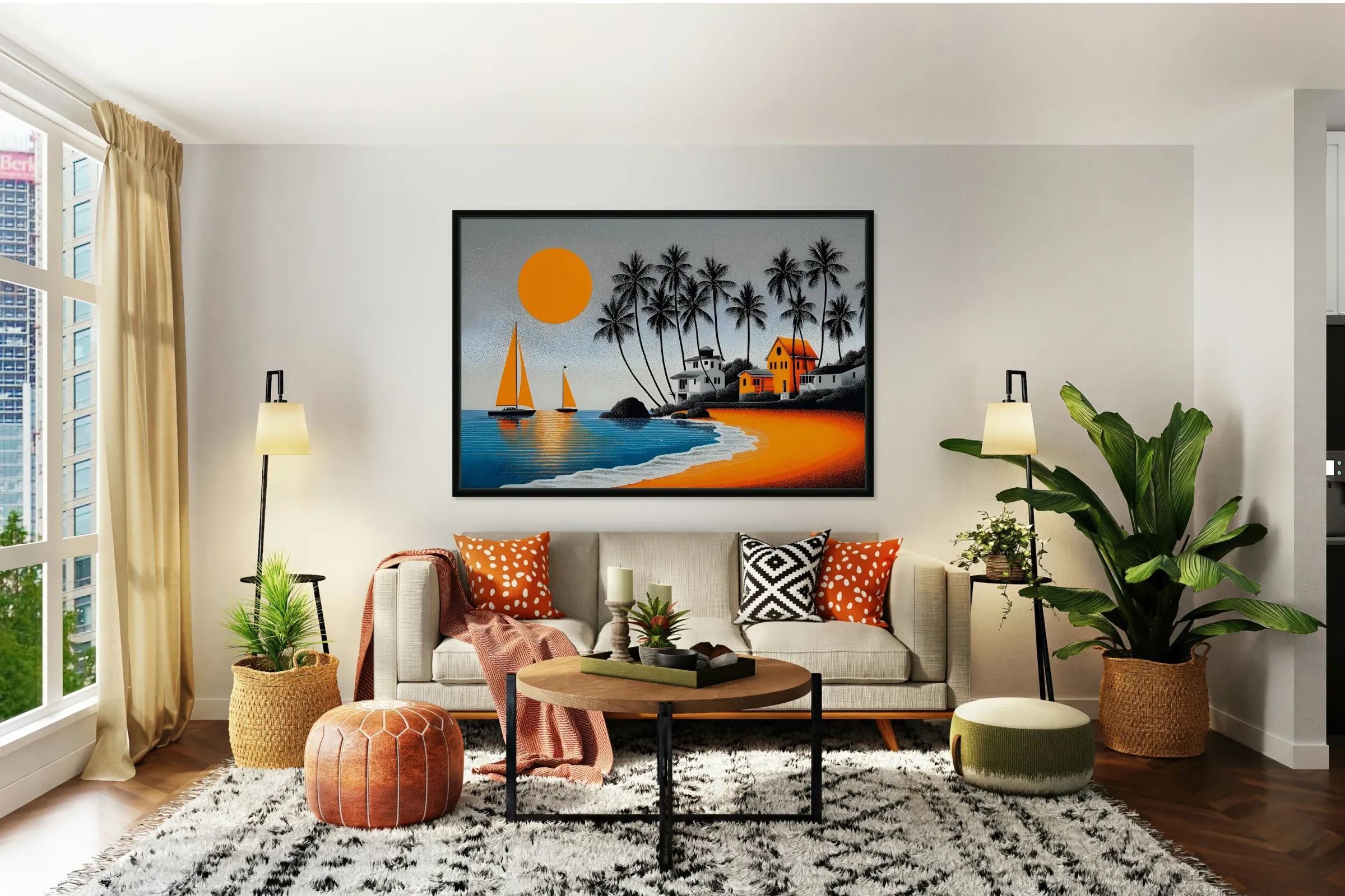 Orange Sun Harbor – Tropical Modern Print is a clean, graphic daydream of coastal life. A giant orange sun hangs over calm water while two sailboats drift toward a curve of bright shoreline, framed by leaning palms and crisp modern houses. The dotted halftone texture nods to vintage travel posters, but the shapes and palette keep it firmly in the now—perfect for anyone chasing a permanent vacation vibe without slipping into cliché beach art. This artwork is available as a giclée canvas print, premium acrylic print, smooth white metal or brushed aluminum piece, and a high-definition sublimatable metal panel that makes the oranges, blues, and blacks hit like ink on a screen. You can also choose a peel-and-stick mural to turn an entire wall into a harbor view, framed editions for turnkey coastal interiors, fine art paper prints for a refined, design-forward look, warm wood prints for an organic surf-shack feel, multi-panel layouts that stretch the shoreline, or puzzle prints for anyone who wants to assemble their own slice of paradise. Curated by Savage Art Prints.