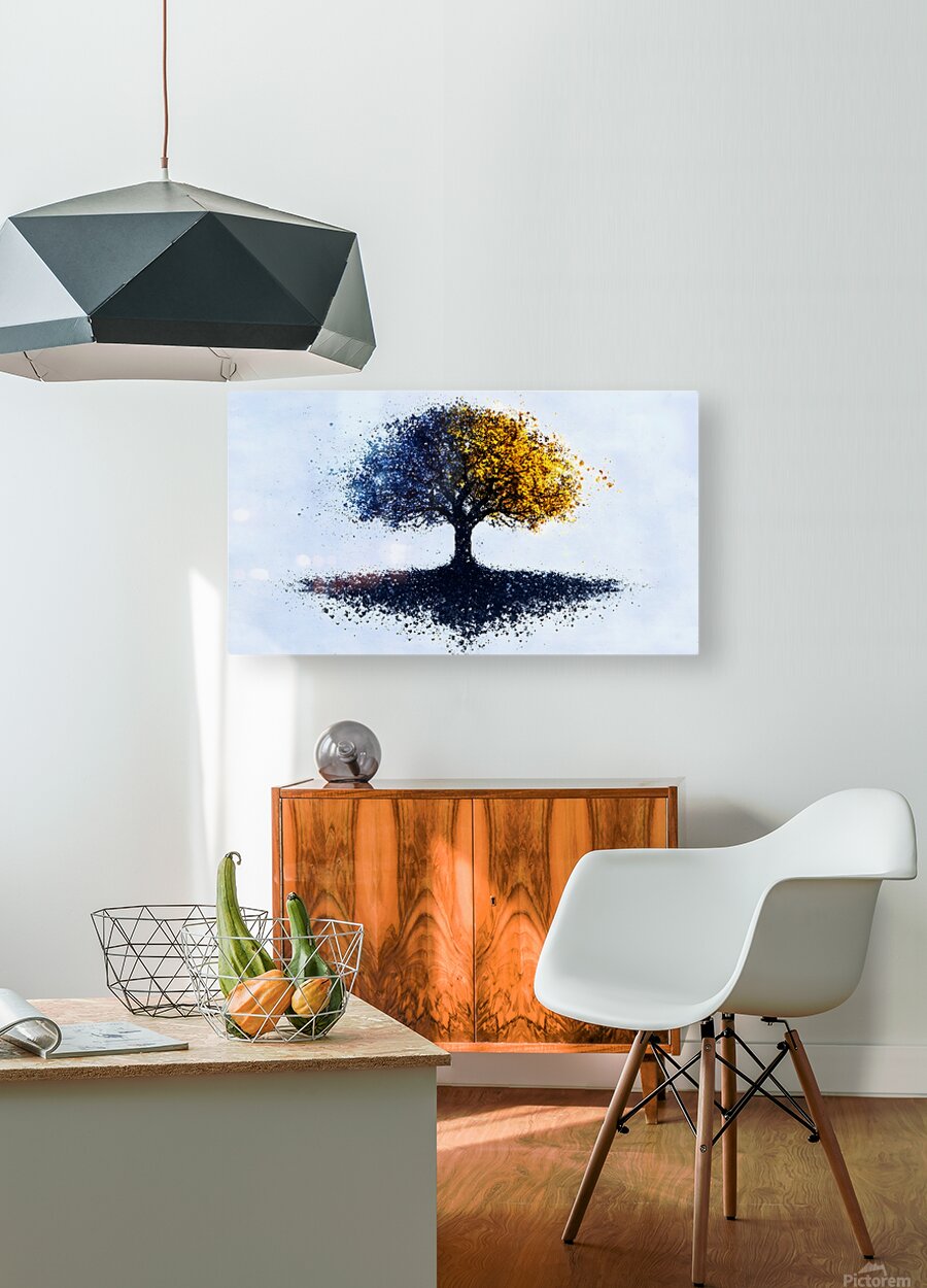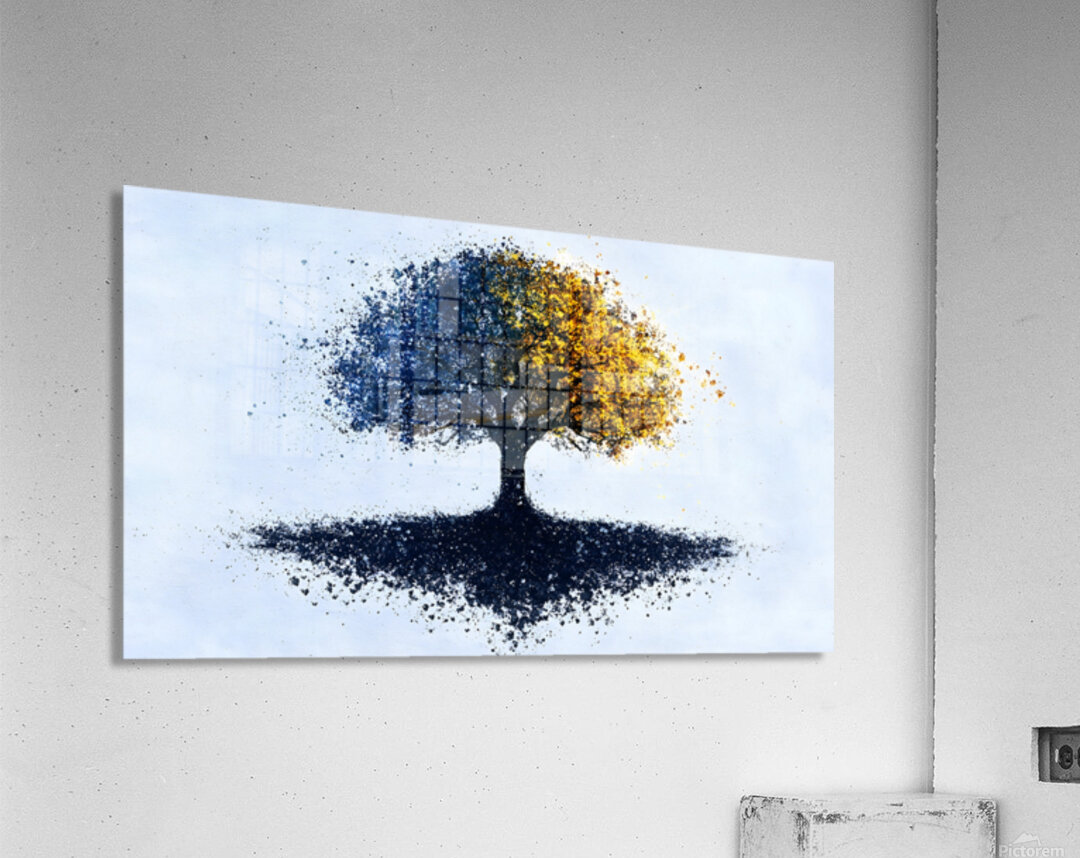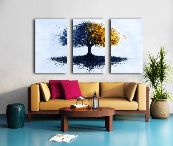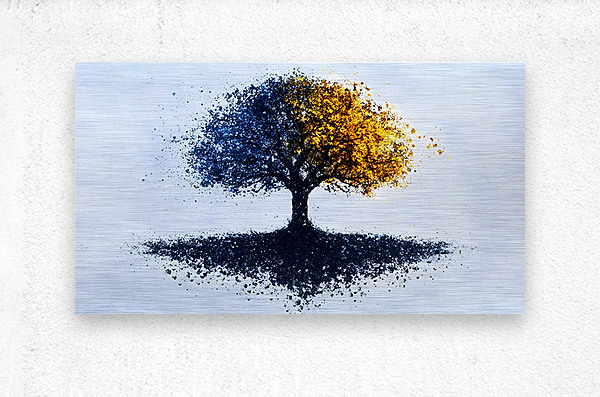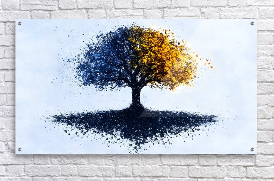 Dual Seasons – Abstract Tree Print takes a single tree and splits it into two moods: deep midnight blue on one side, bright golden yellow on the other. Color explodes in loose splatters that fade into paper white, while a dark mirrored shadow anchors the form below. It suggests change, balance, and the idea that we’re rarely just one thing—perfect for spaces where you want art that feels both symbolic and cleanly modern. This artwork is available as a giclée canvas print, premium acrylic print, smooth white metal or brushed aluminum piece, and a high-definition sublimatable metal panel that keeps every fleck of pigment crisp. You can also choose a peel-and-stick mural to build a full-wall meditation on contrast, framed editions for sleek living rooms and offices, fine art paper prints for a soft, tactile gallery feel, warm wood prints that echo natural themes, multi-panel layouts that extend the tree across wider spaces, or puzzle prints for those who like their metaphors to come together in their hands. Curated by Savage Art Prints.