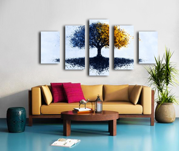 Dual Seasons – Abstract Tree Print takes a single tree and splits it into two moods: deep midnight blue on one side, bright golden yellow on the oth...[+]