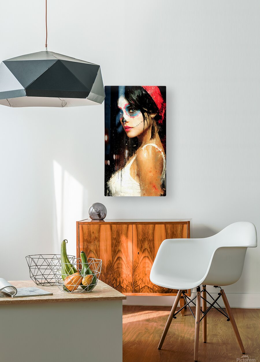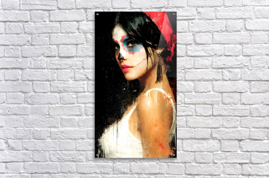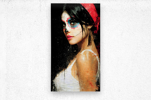 LA MIRADA DEL FUEGO – The Gaze of Fire print captures a Dia de los Muertos beauty caught between light and shadow. Her turquoise and rose sugar-skull makeup glows against a deep black field, while loose brushstrokes and paint splatters give the portrait a raw, urban energy. This piece sits perfectly at the crossroads of romance, rebellion, and cultural tribute. Available as a giclée canvas print, premium acrylic print, smooth white or brushed aluminum, high-definition sublimatable metal, peel-and-stick mural, framed wall art, fine art paper print, wood print, panel piece, or puzzle print—built to suit everything from galleries to apartment walls. Curated by Savage Art Prints.