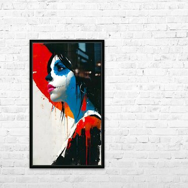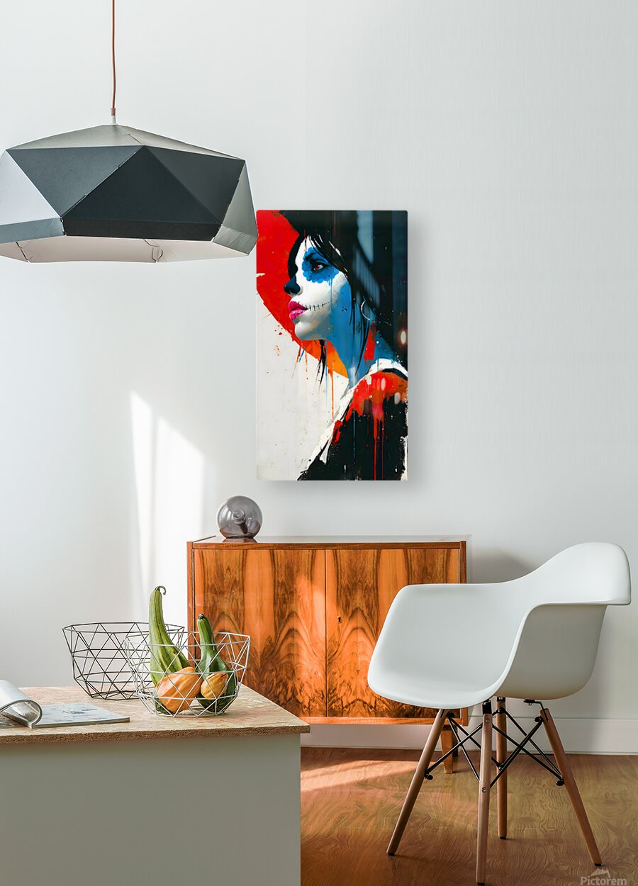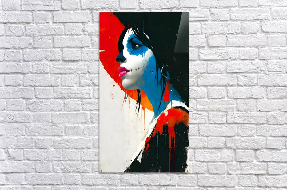 PERFIL DEL ALMA – Soul in Profile print shows a Dia de los Muertos muse carved out of red, white, and electric blue. Her stitched smile and turned gaze feel defiant yet vulnerable, like a street mural frozen mid-story. Rough drips and splashes keep the piece rooted in graffiti energy while honoring the elegance of the sugar-skull tradition. Offered as a giclée canvas print, premium acrylic print, smooth white or brushed aluminum, high-definition sublimatable metal, peel-and-stick mural, framed wall art, fine art paper print, wood print, panel piece, or puzzle print, this artwork scales from intimate corners to full feature walls. Curated by Savage Art Prints.