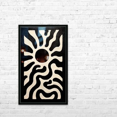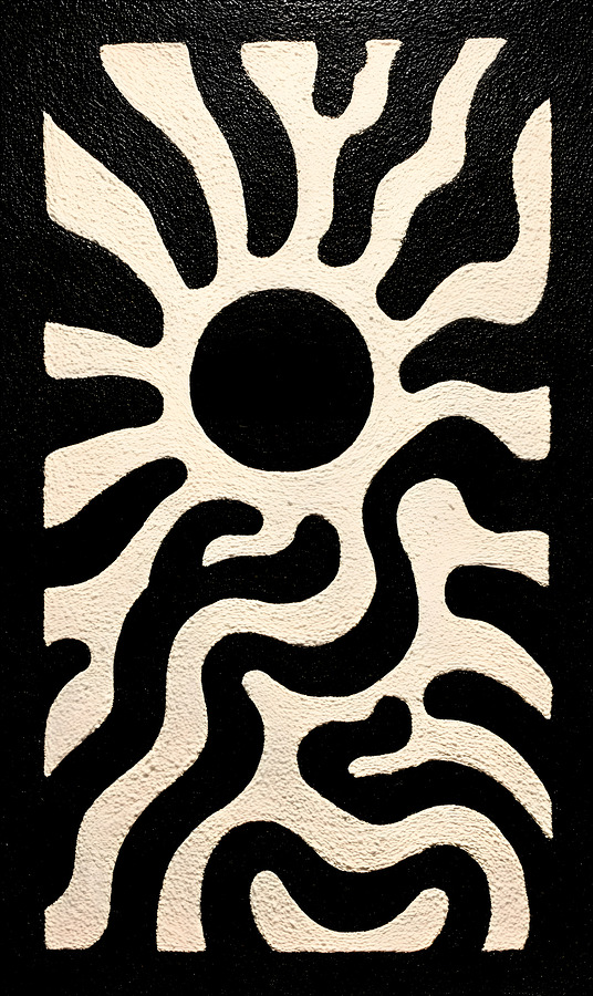 Solar Serpent – Tribal Sun Abstract Print fuses a bold black sun with explosive, flame-like rays and a coiling serpent beneath, all carved in thick,...[+]