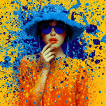 Vivid Rebellion – Color Splash Portrait Print explodes with electric blue and neon yellow paint splatters framing a confident woman in oversized sun...[+]