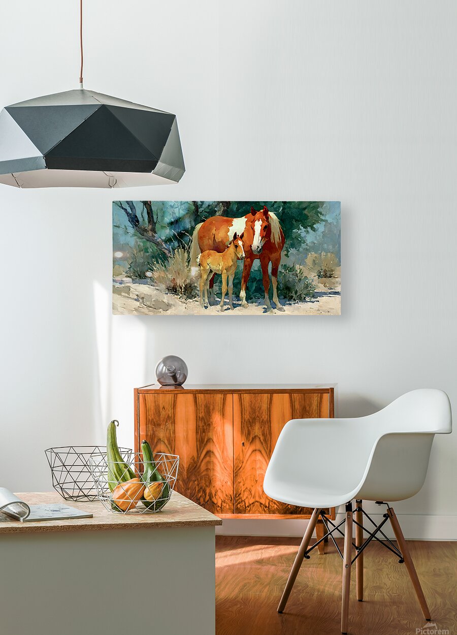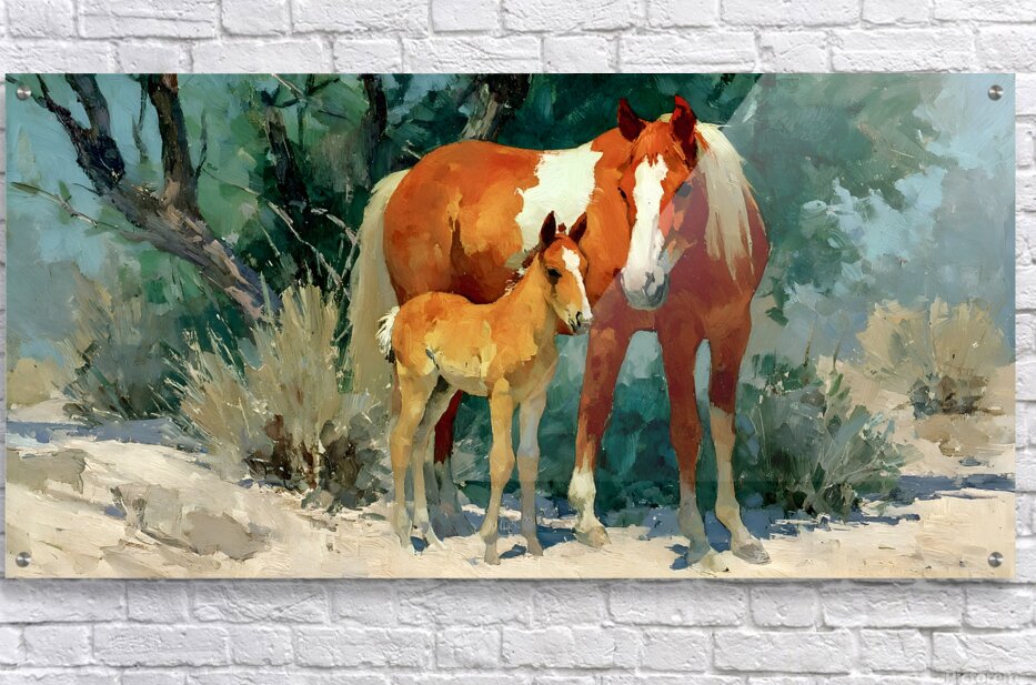 Desert Companions – Mare and Foal Western Print tenderly captures a protective paint mare and her curious foal standing together under a desert tree, bathed in warm southwestern light. This heartwarming scene brings love, legacy, and wide-open freedom to any home—perfect for nurseries, living rooms, or the ultimate gift for horse enthusiasts. This artwork is available as a giclée canvas print for rich color and painterly depth, a premium acrylic print for a sleek, gallery-style sheen, and smooth white metal or brushed aluminum pieces for a contemporary edge. You can also choose high-definition sublimatable metal, peel-and-stick murals, framed options, fine art paper, warm wood prints, multi-panel layouts, or puzzle prints. Curated by Savage Art Prints.