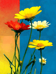 Rainbow Bloom – Color Block Daisy Print explodes with giant red, yellow, and white daisies against a striking vertical color-block background—an i...[+]