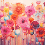 Petal-like shapes bloom in candy pinks, tangerine, coral, and sky blue, drifting upward like balloons in a festival of color. “Bloom Voltage” is a...[+]