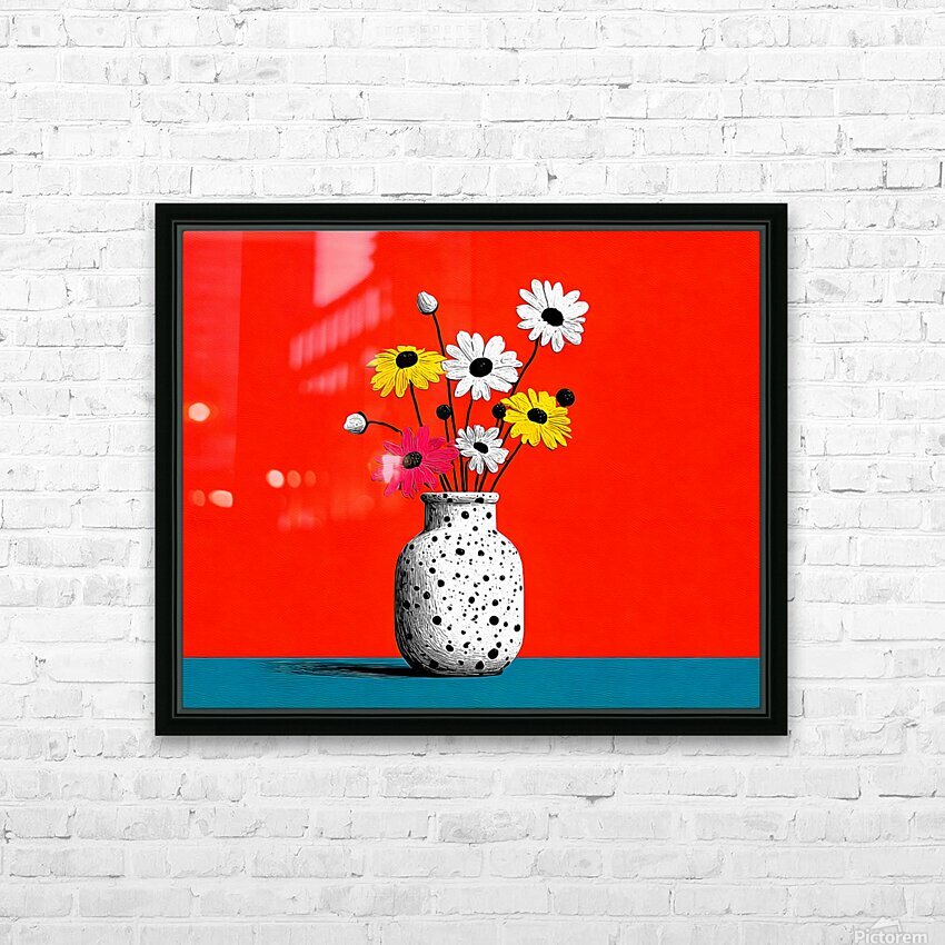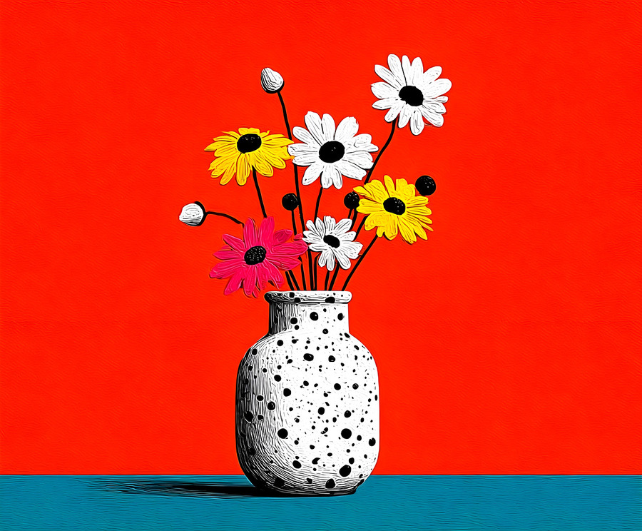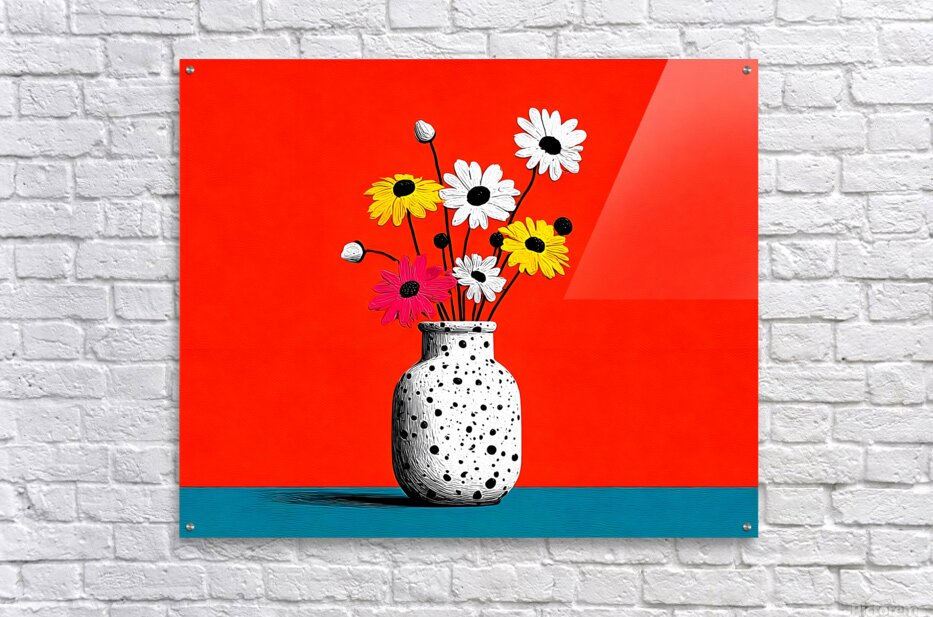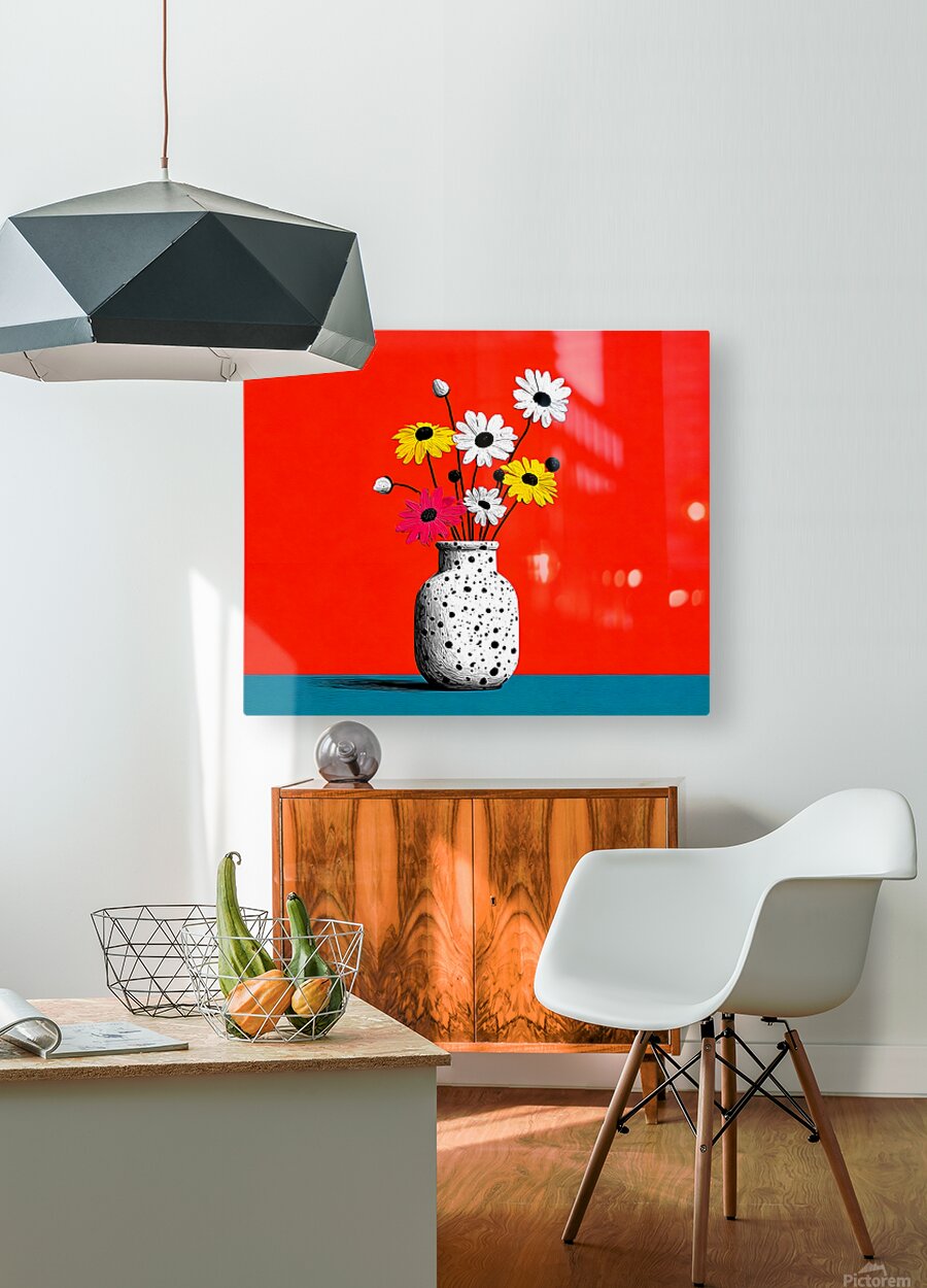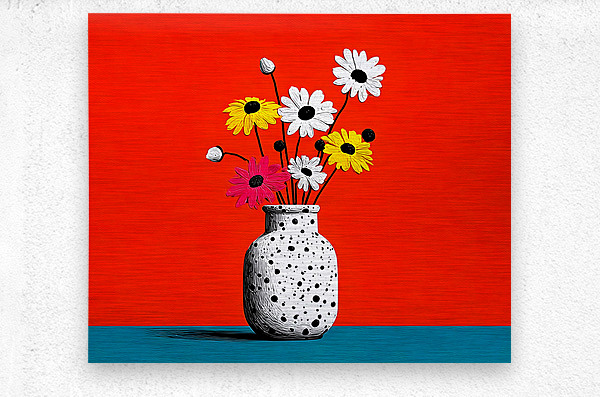 Polka Bloom fuses 1960s optimism with minimalist form. A speckled black-and-white vase holds playful daisies in yellow, pink, and white, set against a vibrant orange backdrop and cool teal base. The simple composition radiates joy and modern charm, bringing a playful pop-art aesthetic to any wall. Ideal for kitchens, studios, and retro-inspired interiors seeking clean lines and color balance. Available in canvas for vintage texture, HD metal for crisp modern contrast, acrylic for luminous shine, or framed fine-art paper for timeless appeal. Curated by Savage Art Prints.