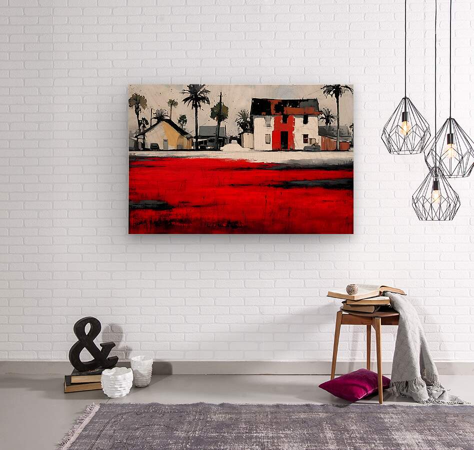 Crimson Lot – Coastal Village Print plants a small row of seaside buildings and palms against a huge, saturated field of red. The houses are sketched in loose whites, creams, and greys with a punch of matching crimson slicing through the central façade, while the sky stays pale and quiet above. It feels like a memory of a forgotten shoreline town—sun-bleached, weather-beaten, and impossible to ignore. This artwork is available as a giclée canvas print, premium acrylic print, smooth white metal or brushed aluminum piece, and a high-definition sublimatable metal panel that makes the reds deep and the neutrals subtle. You can also choose a peel-and-stick mural to pour that red field across an entire wall, framed editions for modern coastal and farmhouse interiors, fine art paper prints for a softer, painterly impression, warm wood prints that emphasize the rustic vibe, multi-panel layouts that stretch the village and horizon, or puzzle prints for those who want to piece together their own lost town. Curated by Savage Art Prints.