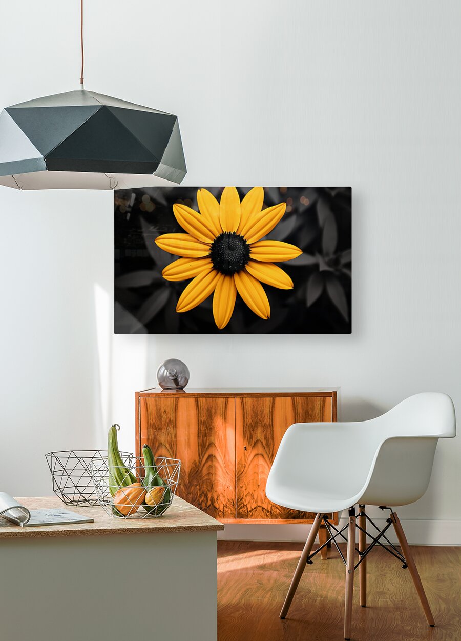 SUR CETTE OEUVRE: LONE GLOW – YELLOW SUNFLOWER ON BLACK PRINT